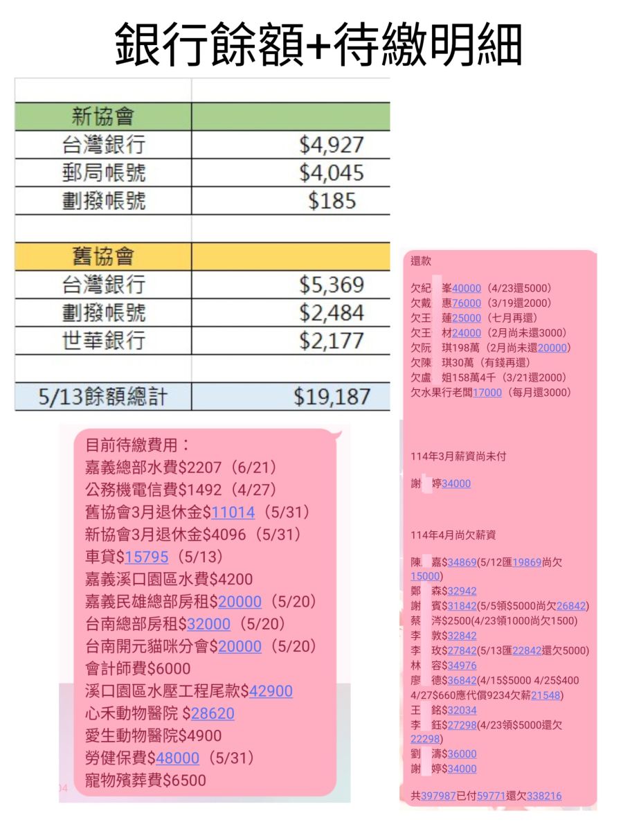 😆結論:目前距離平安度過這個月還差16萬元,距離繳清廠商欠款醫療殯葬欠款還差24萬元,明細放在圖片裡,謝謝大家的支持,我會持續監督協會金流,確保大家的善款透明👍!