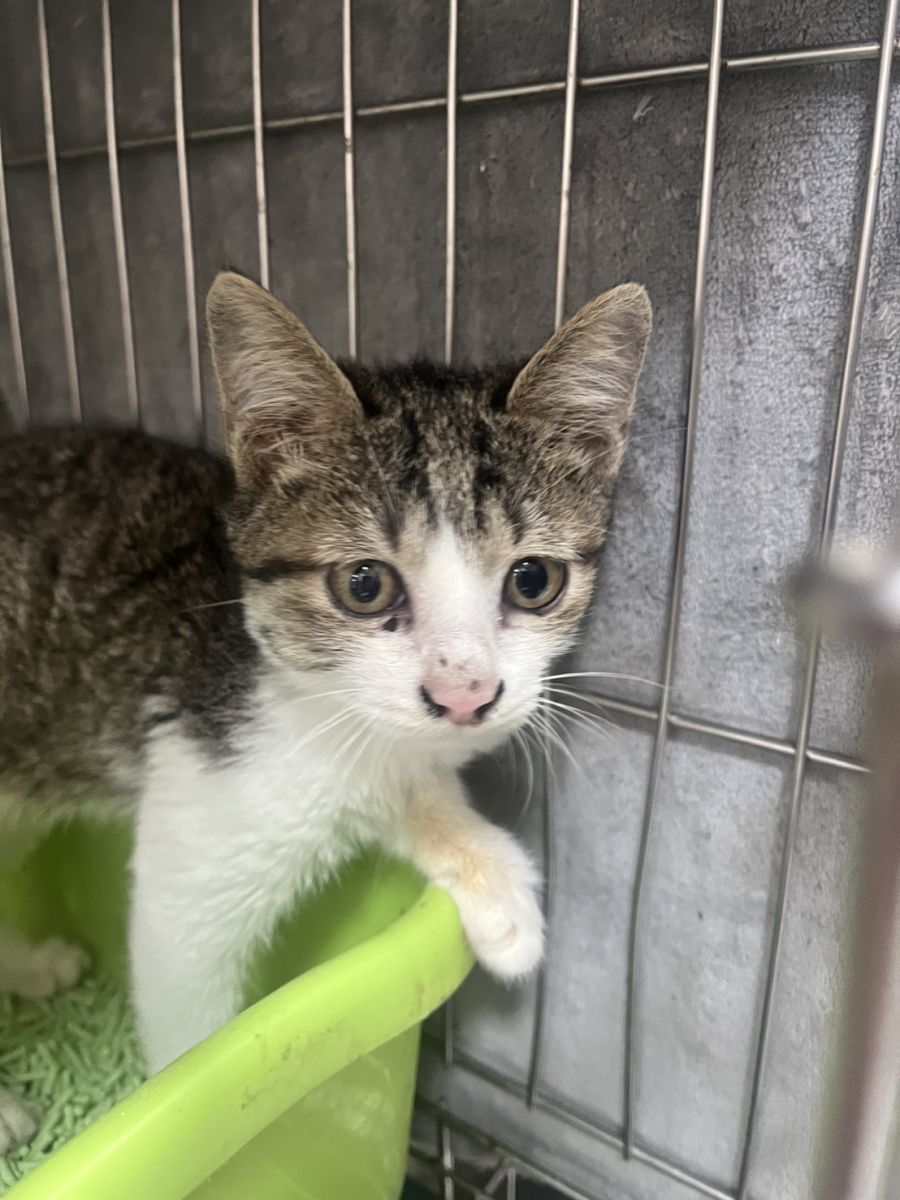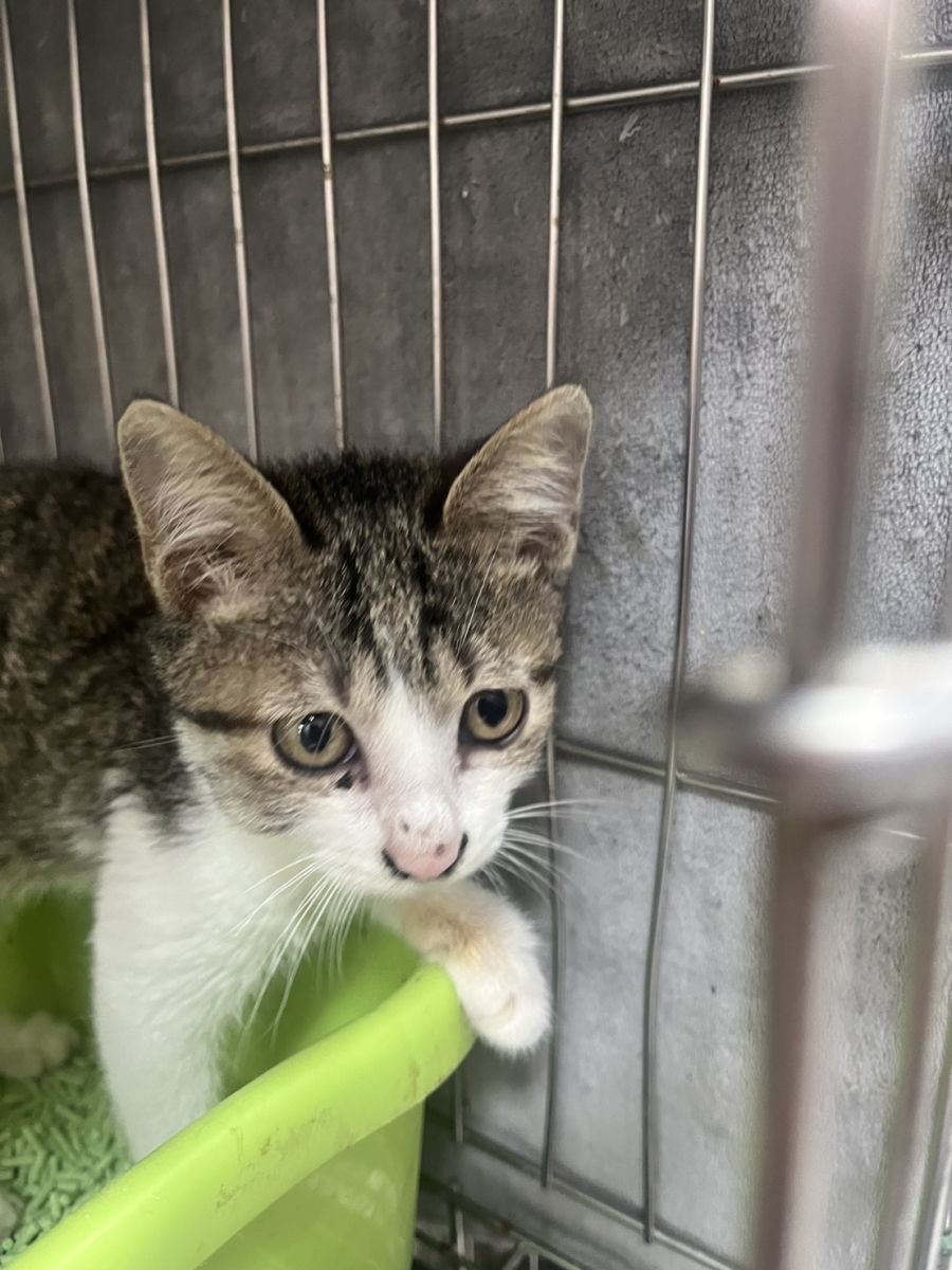 白底虎斑幼貓「小湖」目前已安置在台南總部休養,在穩定的環境與細心照料下,小湖的食慾明顯恢復,現在會主動進食、精神也越來越好
