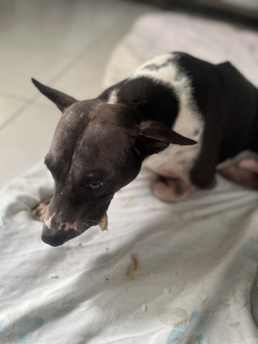 想起當時在2022/2/13救援大埔這孩子,孤身在山上流浪,前腳遭捕獸夾傷害斷了,又被車子撞到脊椎,導致終生癱瘓只剩下一隻腳可以動,原本很兇的孩子看到人就害怕要咬人,經過長時間照顧培養感情,現在的大埔是非常乖巧且親人可愛的孩子!