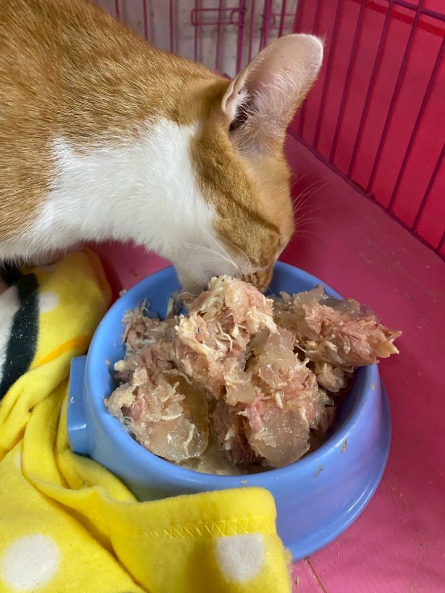 2024/05/09報案人自述下班後依慣例餵食浪貓時,發現了橘白母貓有脫肛的情況,請求協會前往進行救援以及後續醫療照護,貓咪取名吃貨